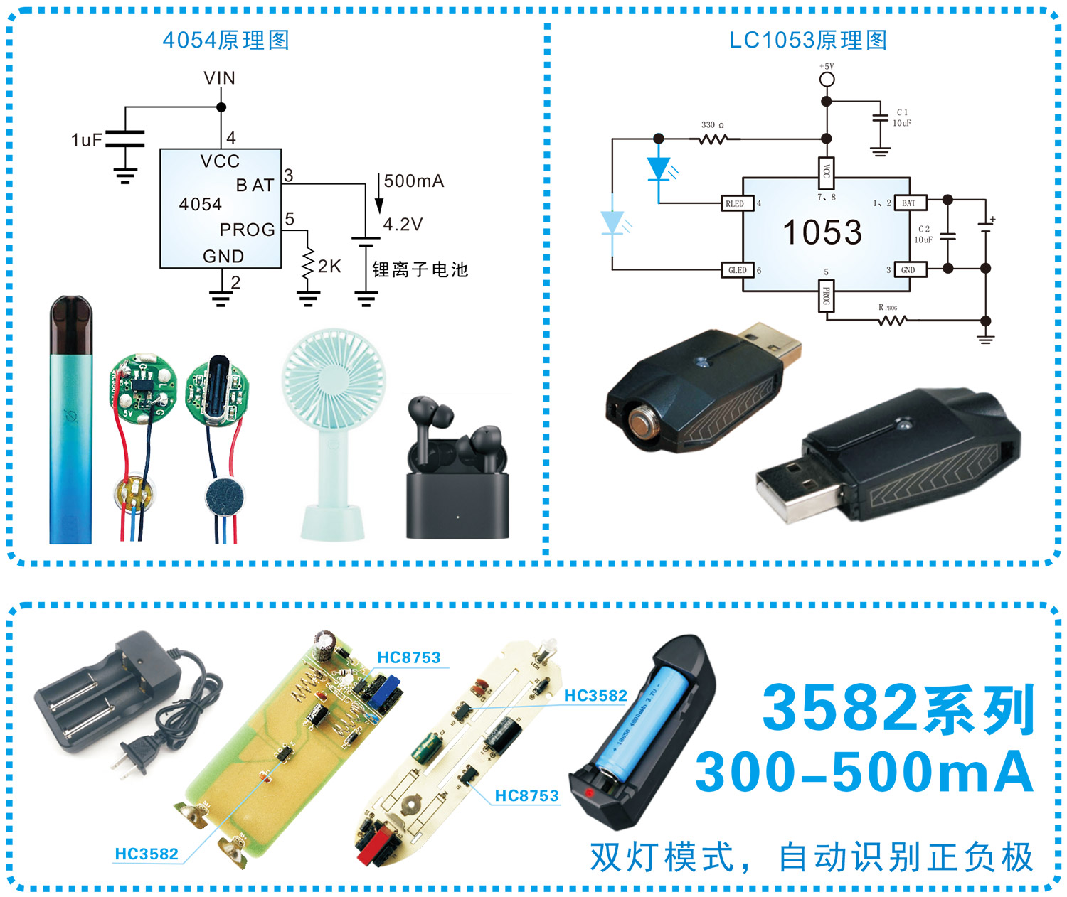 | LC1053 | 单节锂电充电电路 | 电子烟锂电池充电保护电路,输出4.2V,电流1A | SOP-8 |